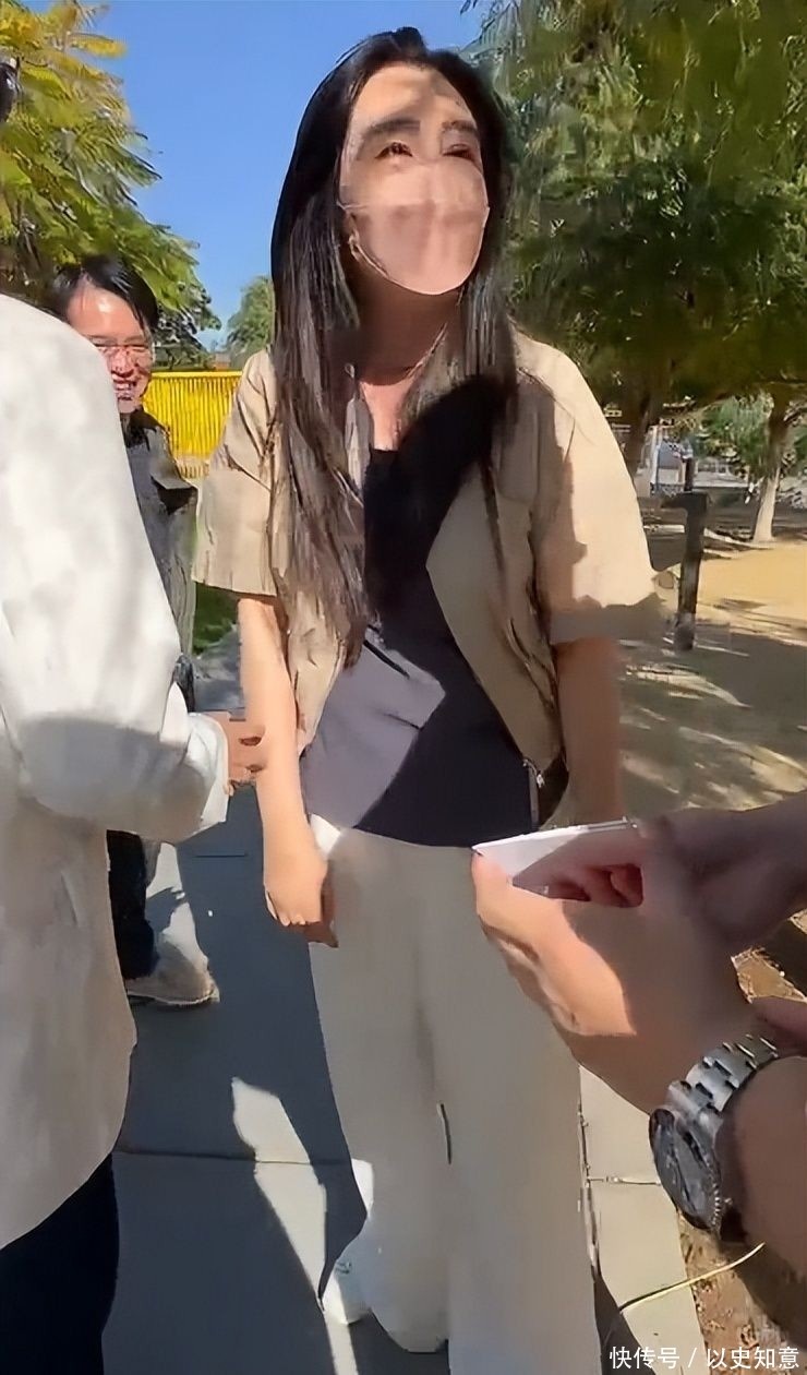 她所穿的上衣布料松垮褶皱,轮廓模糊、线条全无,仿佛刚从收纳箱中取出便直接上身,毫无造型意识与审美打理;下装搭配一条宽大垂坠的休闲裤,脚踩一双未加修饰的平底鞋,通身上下不见一丝昔日明星的考究感,倒透出几分自在松弛的生活本味。